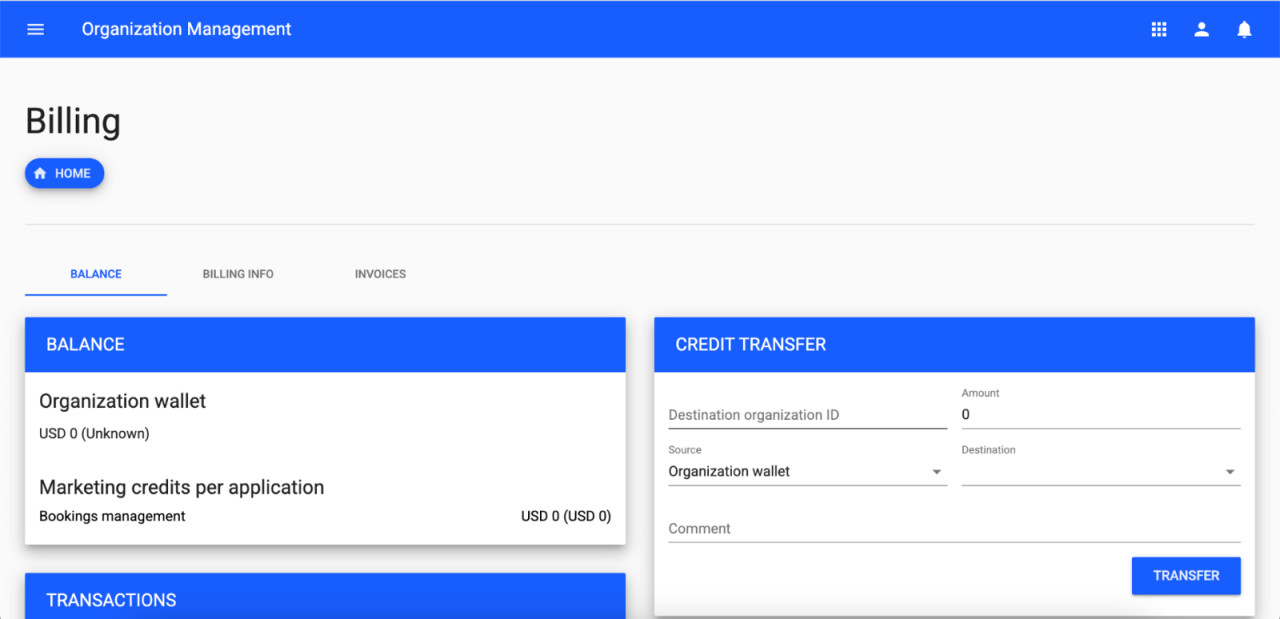 The Balance section now provides a clear overview of your organization's wallet, including marketing credit allocations per application. You can also transfer credits to other organizations right from the interface.