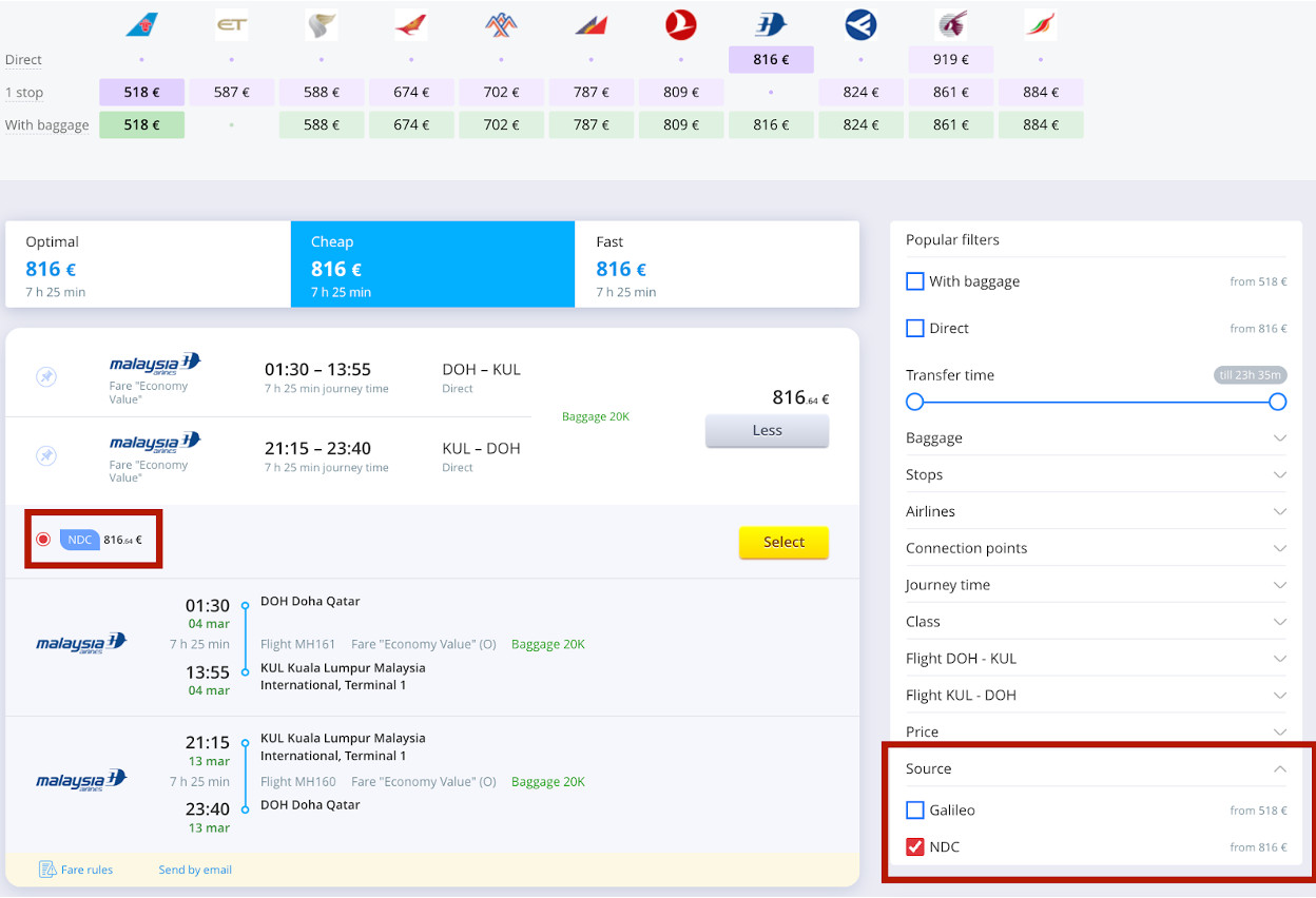 A new option to display NDC content in search results is available for consolidators in testing. Once activated, it enables ticketing and itinerary generation through SmartAgent.